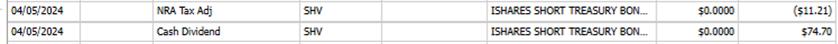 Please note that “interest” income from US bond ETFs like SHV, BND, VCSH, etc. are treated as dividends and therefore subject to 15% withholding. An example at Charles Schwab is below: